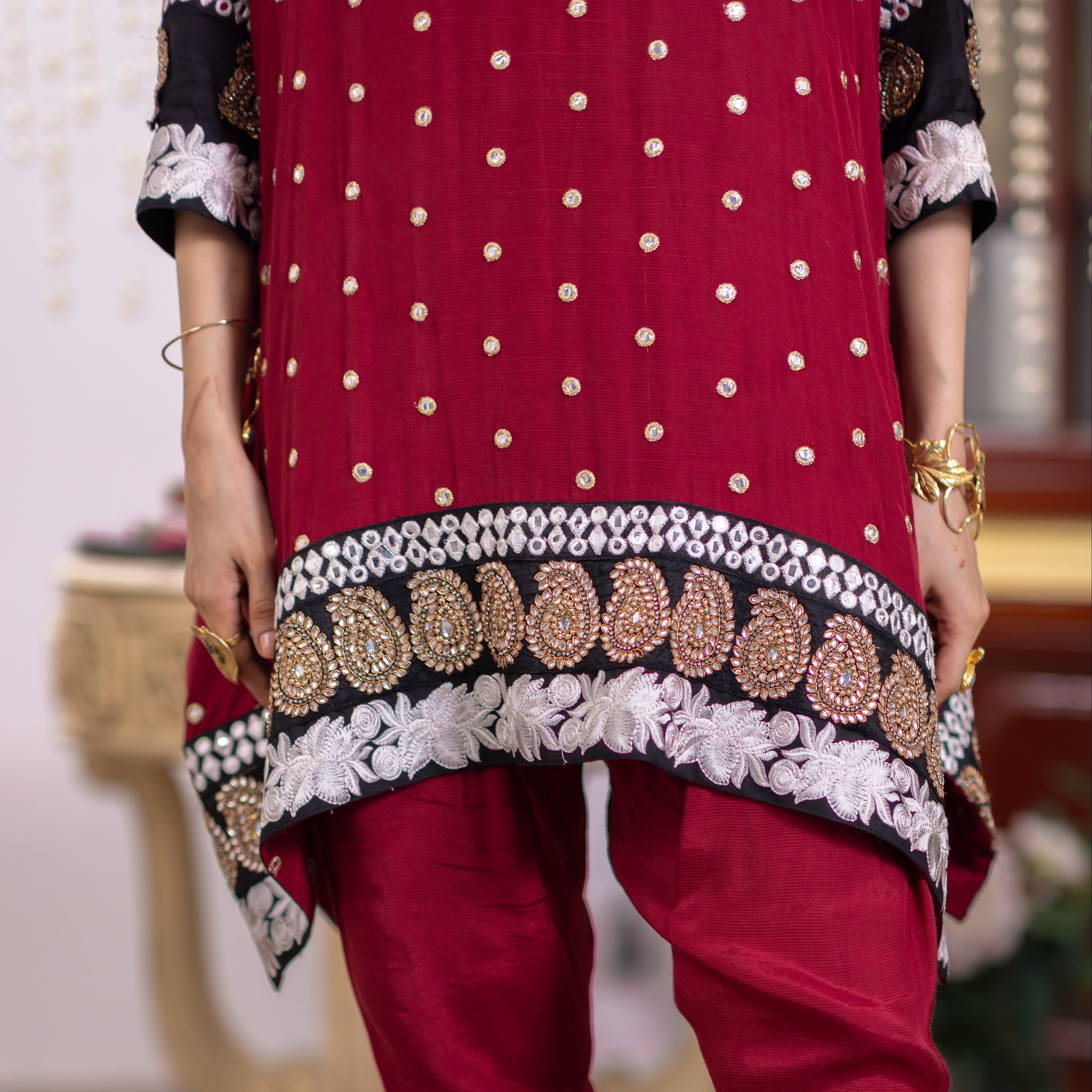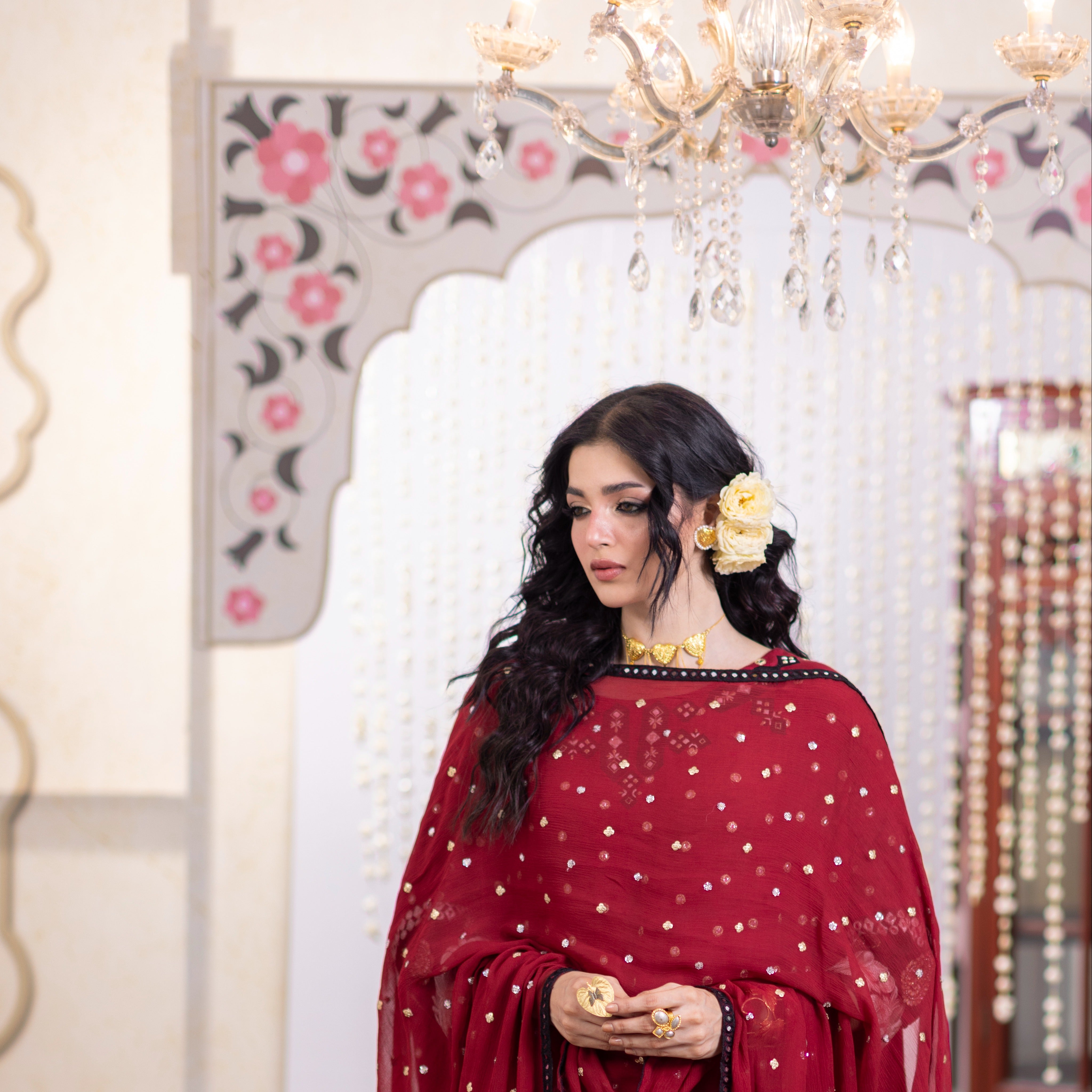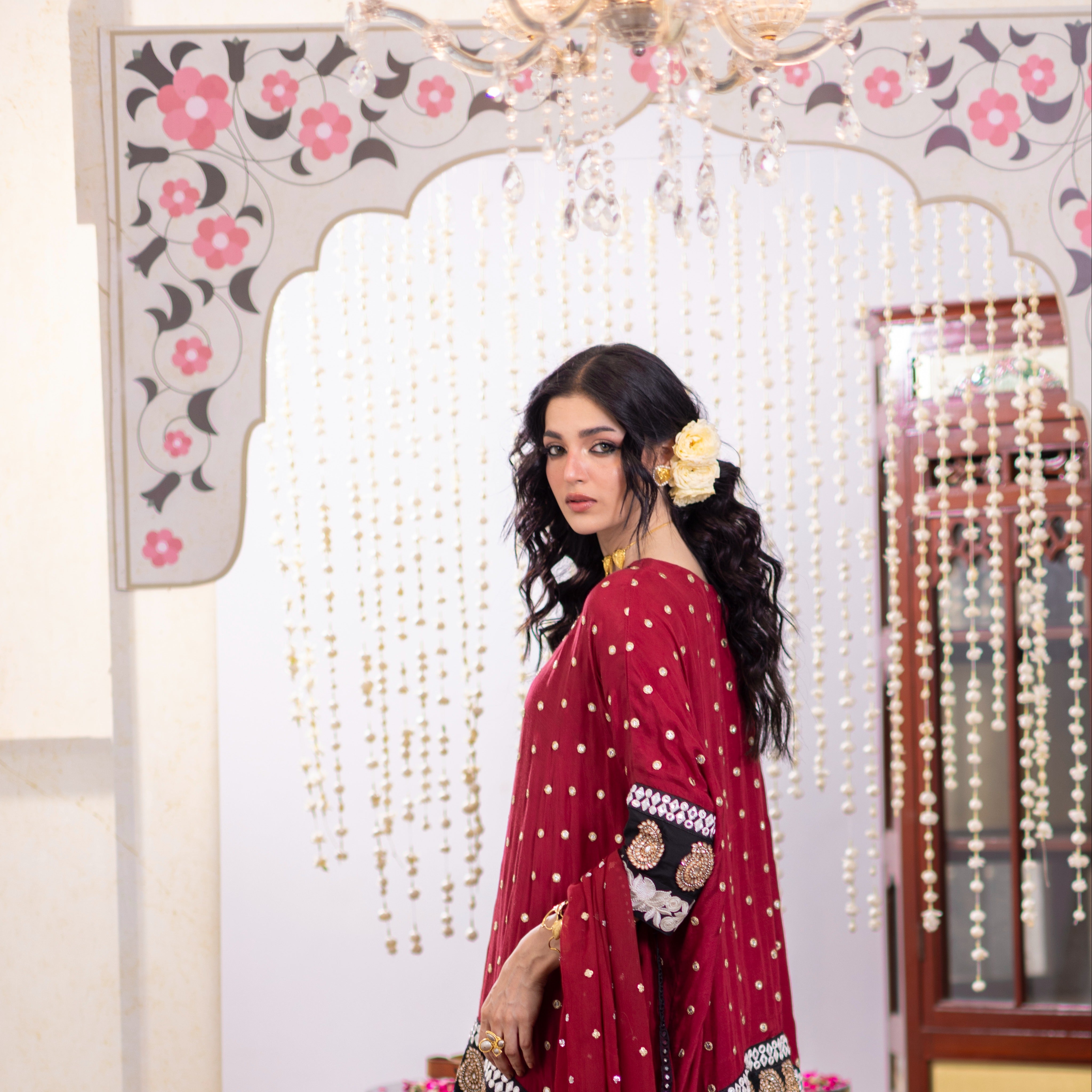 A timeless cherry red ensemble crafted to perfection with a modern silhouette. This three-piece outfit features a contemporary boxy-fit shirt paired with a signature balloon shalwar, creating a bold yet elegant statement look.